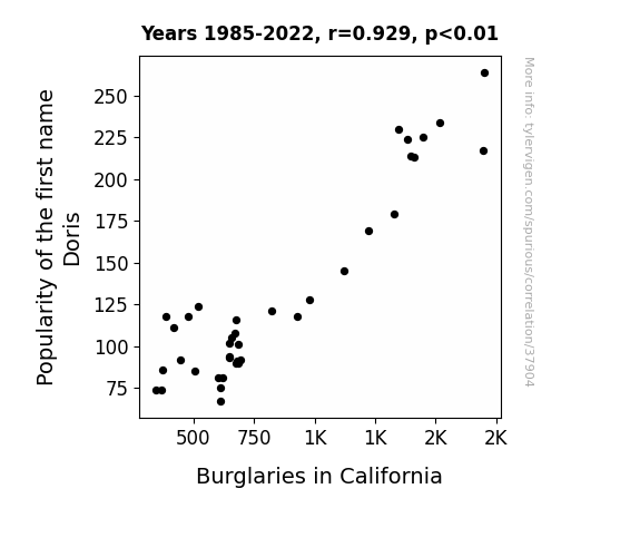 This means 86.4% of the change in the one variable (i.e., Burglaries in California) is predictable based on the change in the other (i.e., Popularity of the first name Doris) over the 38 years from 1985 through 2022.
