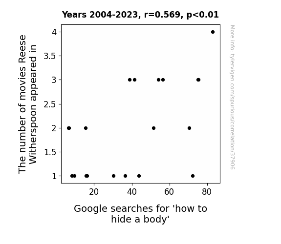 This means 32.4% of the change in the one variable (i.e., Google searches for 'how to hide a body') is predictable based on the change in the other (i.e., The number of movies Reese Witherspoon appeared in) over the 20 years from 2004 through 2023.