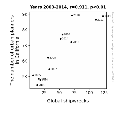 This means 83% of the change in the one variable (i.e., Global shipwrecks ) is predictable based on the change in the other (i.e., The number of urban planners in California) over the 12 years from 2003 through 2014.