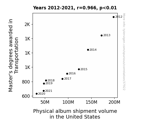 This means 93.4% of the change in the one variable (i.e., Physical album shipment volume in the United States) is predictable based on the change in the other (i.e., Master's degrees awarded in Transportation) over the 10 years from 2012 through 2021.