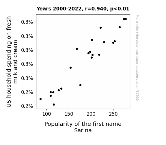 This means 88.3% of the change in the one variable (i.e., Popularity of the first name Sarina) is predictable based on the change in the other (i.e., US household spending on fresh milk and cream) over the 23 years from 2000 through 2022.