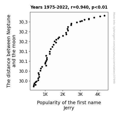 This means 88.4% of the change in the one variable (i.e., Popularity of the first name Jerry) is predictable based on the change in the other (i.e., The distance between Neptune and the moon) over the 48 years from 1975 through 2022.