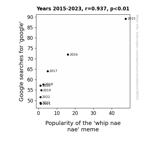 This means 87.9% of the change in the one variable (i.e., Popularity of the 'whip nae nae' meme) is predictable based on the change in the other (i.e., Google searches for 'google') over the 9 years from 2015 through 2023.