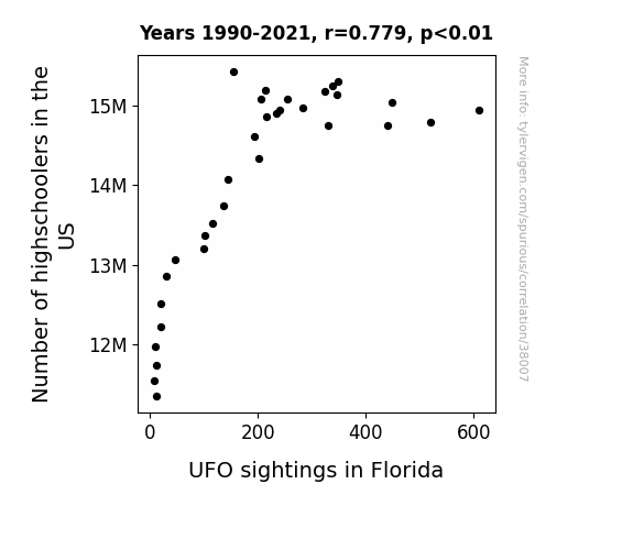 This means 60.6% of the change in the one variable (i.e., UFO sightings in Florida) is predictable based on the change in the other (i.e., Number of highschoolers in the US) over the 32 years from 1990 through 2021.