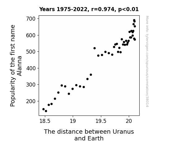 This means 94.8% of the change in the one variable (i.e., The distance between Uranus and Earth) is predictable based on the change in the other (i.e., Popularity of the first name Alanna) over the 48 years from 1975 through 2022.
