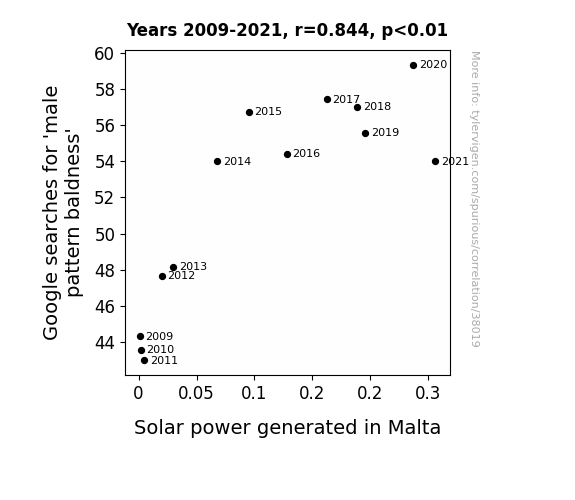 This means 71.3% of the change in the one variable (i.e., Solar power generated in Malta) is predictable based on the change in the other (i.e., Google searches for 'male pattern baldness') over the 13 years from 2009 through 2021.