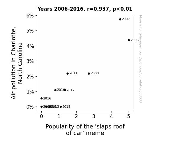 This means 87.8% of the change in the one variable (i.e., Popularity of the 'slaps roof of car' meme) is predictable based on the change in the other (i.e., Air pollution in Charlotte, North Carolina) over the 11 years from 2006 through 2016.
