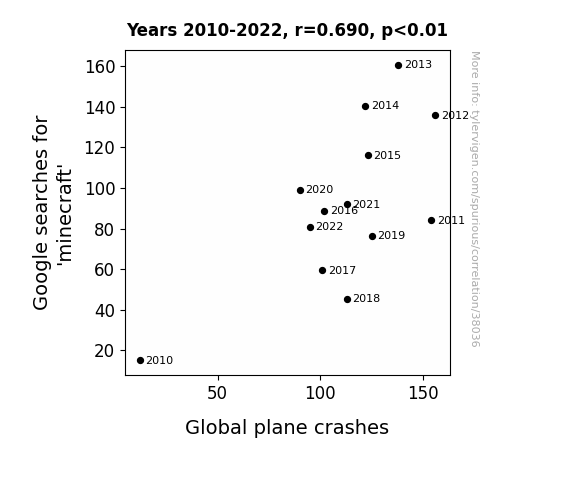 This means 47.6% of the change in the one variable (i.e., Global plane crashes) is predictable based on the change in the other (i.e., Google searches for 'minecraft') over the 13 years from 2010 through 2022.