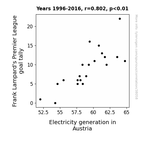 This means 64.3% of the change in the one variable (i.e., Electricity generation in Austria) is predictable based on the change in the other (i.e., Frank Lampard's Premier League goal tally) over the 21 years from 1996 through 2016.