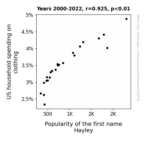 This means 85.6% of the change in the one variable (i.e., Popularity of the first name Hayley) is predictable based on the change in the other (i.e., US household spending on clothing) over the 23 years from 2000 through 2022.