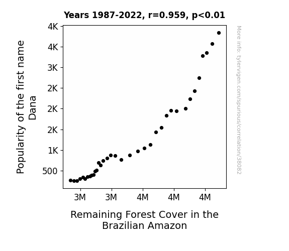 This means 91.9% of the change in the one variable (i.e., Remaining Forest Cover in the Brazilian Amazon) is predictable based on the change in the other (i.e., Popularity of the first name Dana) over the 36 years from 1987 through 2022.