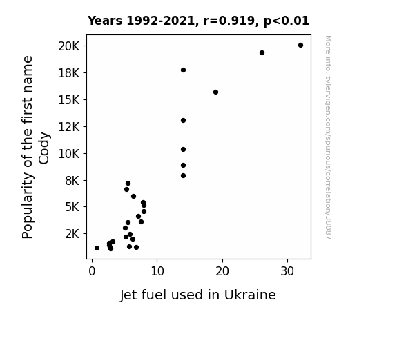 This means 84.5% of the change in the one variable (i.e., Jet fuel used in Ukraine) is predictable based on the change in the other (i.e., Popularity of the first name Cody) over the 30 years from 1992 through 2021.