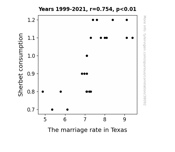 This means 56.9% of the change in the one variable (i.e., The marriage rate in Texas) is predictable based on the change in the other (i.e., Sherbet consumption) over the 23 years from 1999 through 2021.