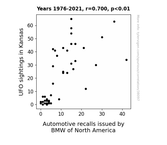 This means 49.1% of the change in the one variable (i.e., Automotive recalls issued by BMW of North America) is predictable based on the change in the other (i.e., UFO sightings in Kansas) over the 46 years from 1976 through 2021.