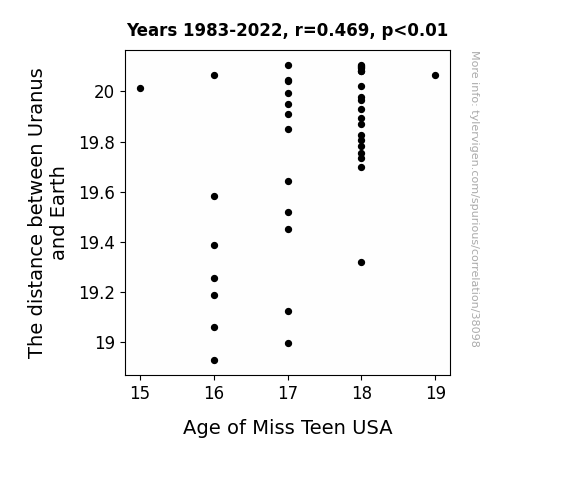 This means 22% of the change in the one variable (i.e., Age of Miss Teen USA) is predictable based on the change in the other (i.e., The distance between Uranus and Earth) over the 40 years from 1983 through 2022.