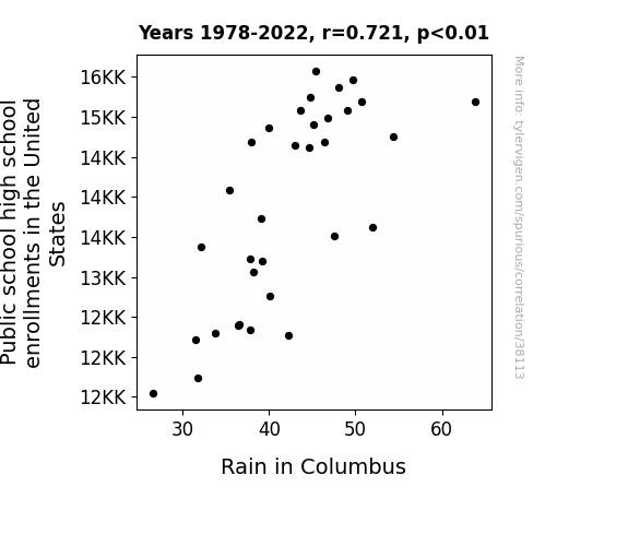 This means 52% of the change in the one variable (i.e., Rain in Columbus) is predictable based on the change in the other (i.e., Public school high school enrollments in the United States) over the 33 years from 1978 through 2022.