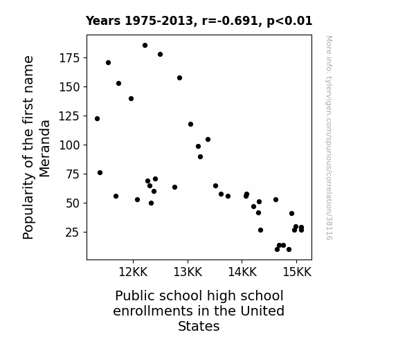 This means 47.7% of the change in the one variable (i.e., Public school high school enrollments in the United States) is predictable based on the change in the other (i.e., Popularity of the first name Meranda) over the 39 years from 1975 through 2013.