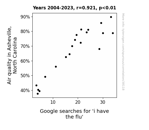 This means 84.8% of the change in the one variable (i.e., Google searches for 'i have the flu') is predictable based on the change in the other (i.e., Air quality in Asheville, North Carolina) over the 20 years from 2004 through 2023.