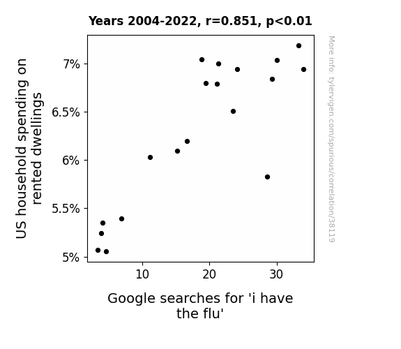 This means 72.4% of the change in the one variable (i.e., Google searches for 'i have the flu') is predictable based on the change in the other (i.e., US household spending on rented dwellings) over the 19 years from 2004 through 2022.