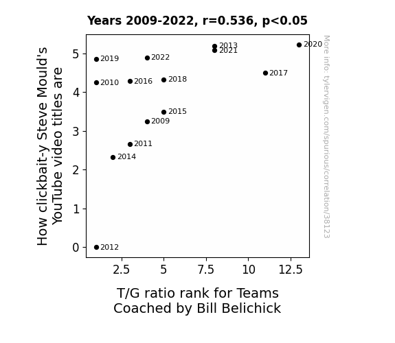 This means 28.7% of the change in the one variable (i.e., T/G ratio rank for Teams Coached by Bill Belichick) is predictable based on the change in the other (i.e., How clickbait-y Steve Mould's YouTube video titles are) over the 14 years from 2009 through 2022.