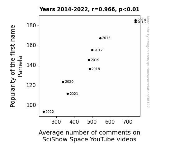 This means 93.4% of the change in the one variable (i.e., Average number of comments on SciShow Space YouTube videos) is predictable based on the change in the other (i.e., Popularity of the first name Pamela) over the 9 years from 2014 through 2022.