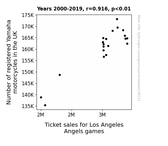 This means 83.9% of the change in the one variable (i.e., Ticket sales for Los Angeles Angels games) is predictable based on the change in the other (i.e., Number of registered Yamaha motorcycles in the UK) over the 20 years from 2000 through 2019.