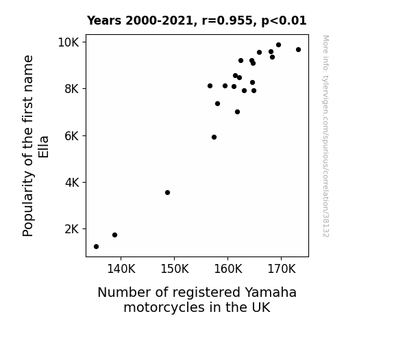 This means 91.2% of the change in the one variable (i.e., Number of registered Yamaha motorcycles in the UK) is predictable based on the change in the other (i.e., Popularity of the first name Ella) over the 22 years from 2000 through 2021.
