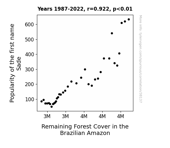 This means 84.9% of the change in the one variable (i.e., Remaining Forest Cover in the Brazilian Amazon) is predictable based on the change in the other (i.e., Popularity of the first name Sade) over the 36 years from 1987 through 2022.