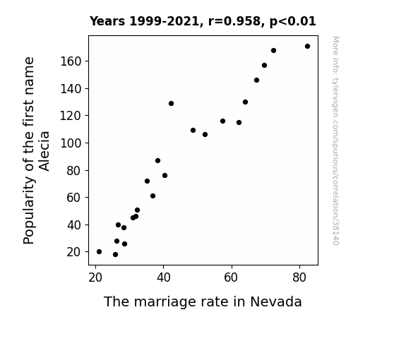 This means 91.7% of the change in the one variable (i.e., The marriage rate in Nevada) is predictable based on the change in the other (i.e., Popularity of the first name Alecia) over the 23 years from 1999 through 2021.