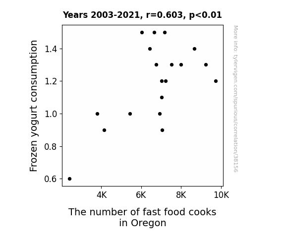 This means 36.3% of the change in the one variable (i.e., The number of fast food cooks in Oregon) is predictable based on the change in the other (i.e., Frozen yogurt consumption) over the 19 years from 2003 through 2021.