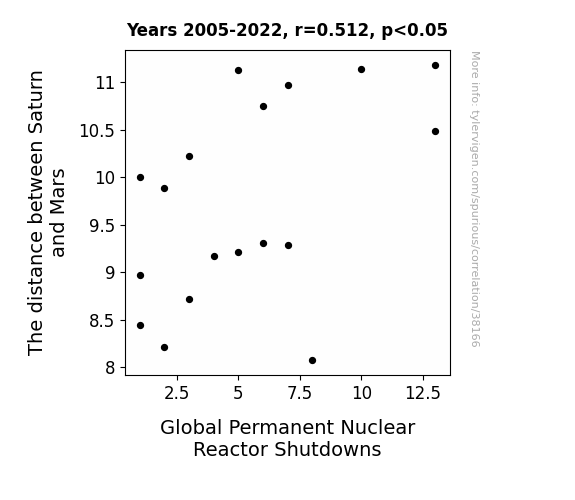 This means 26.2% of the change in the one variable (i.e., Global Permanent Nuclear Reactor Shutdowns) is predictable based on the change in the other (i.e., The distance between Saturn and Mars) over the 18 years from 2005 through 2022.