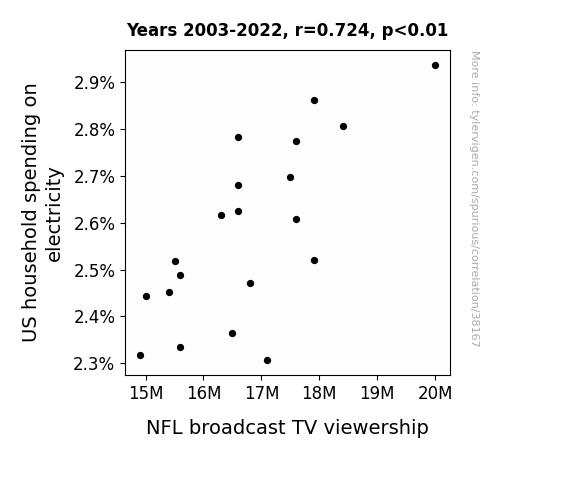 This means 52.4% of the change in the one variable (i.e., NFL broadcast TV viewership) is predictable based on the change in the other (i.e., US household spending on electricity) over the 20 years from 2003 through 2022.