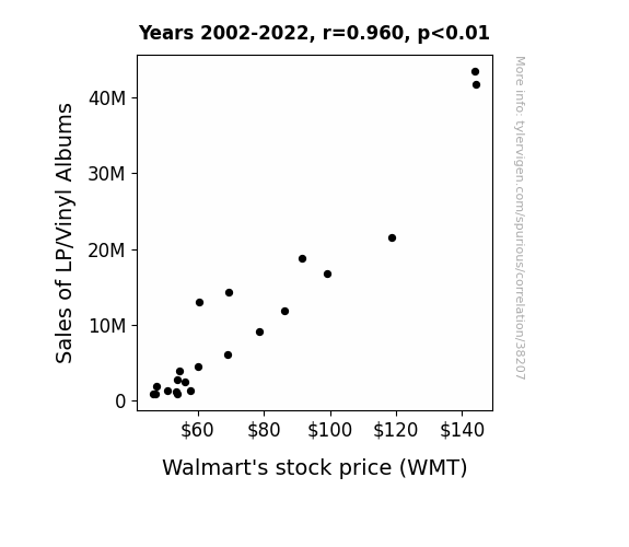 This means 92.2% of the change in the one variable (i.e., Walmart's stock price (WMT)) is predictable based on the change in the other (i.e., Sales of LP/Vinyl Albums) over the 21 years from 2002 through 2022.