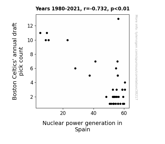 This means 53.6% of the change in the one variable (i.e., Nuclear power generation in Spain) is predictable based on the change in the other (i.e., Boston Celtics' annual draft pick count) over the 42 years from 1980 through 2021.