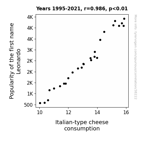This means 97.1% of the change in the one variable (i.e., Italian-type cheese consumption) is predictable based on the change in the other (i.e., Popularity of the first name Leonardo) over the 27 years from 1995 through 2021.