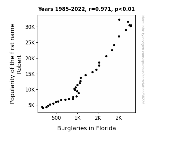 This means 94.2% of the change in the one variable (i.e., Burglaries in Florida) is predictable based on the change in the other (i.e., Popularity of the first name Robert) over the 38 years from 1985 through 2022.