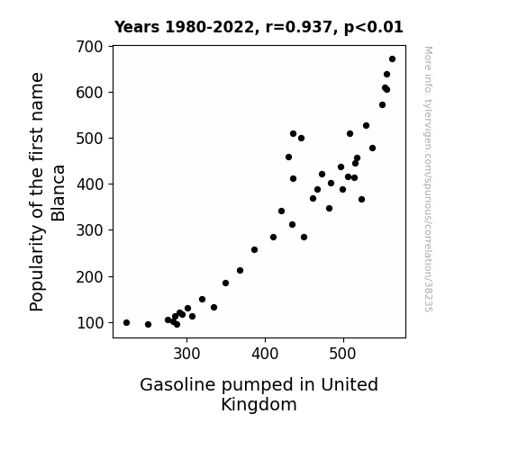 This means 87.7% of the change in the one variable (i.e., Gasoline pumped in United Kingdom) is predictable based on the change in the other (i.e., Popularity of the first name Blanca) over the 43 years from 1980 through 2022.