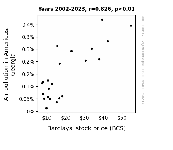 This means 68.3% of the change in the one variable (i.e., Barclays' stock price (BCS)) is predictable based on the change in the other (i.e., Air pollution in Americus, Georgia) over the 22 years from 2002 through 2023.