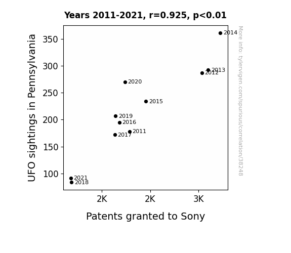This means 85.6% of the change in the one variable (i.e., Patents granted to Sony) is predictable based on the change in the other (i.e., UFO sightings in Pennsylvania) over the 11 years from 2011 through 2021.