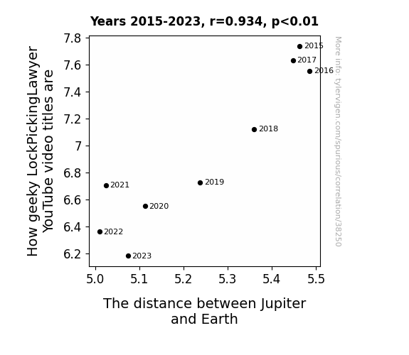 This means 87.3% of the change in the one variable (i.e., The distance between Jupiter and Earth) is predictable based on the change in the other (i.e., How geeky LockPickingLawyer YouTube video titles are) over the 9 years from 2015 through 2023.