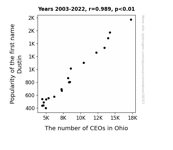 This means 97.9% of the change in the one variable (i.e., The number of CEOs in Ohio) is predictable based on the change in the other (i.e., Popularity of the first name Dustin) over the 20 years from 2003 through 2022.