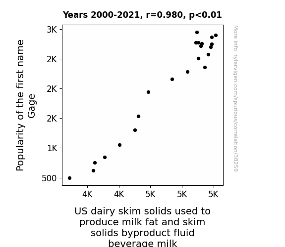 This means 96% of the change in the one variable (i.e., US dairy skim solids used to produce milk fat and skim solids byproduct fluid beverage milk) is predictable based on the change in the other (i.e., Popularity of the first name Gage) over the 22 years from 2000 through 2021.