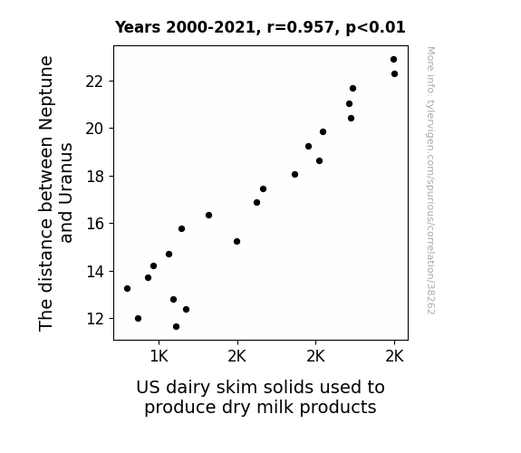 This means 91.5% of the change in the one variable (i.e., US dairy skim solids used to produce dry milk products) is predictable based on the change in the other (i.e., The distance between Neptune and Uranus) over the 22 years from 2000 through 2021.