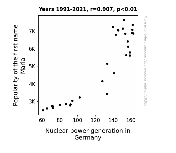 This means 82.3% of the change in the one variable (i.e., Nuclear power generation in Germany) is predictable based on the change in the other (i.e., Popularity of the first name Maria) over the 31 years from 1991 through 2021.