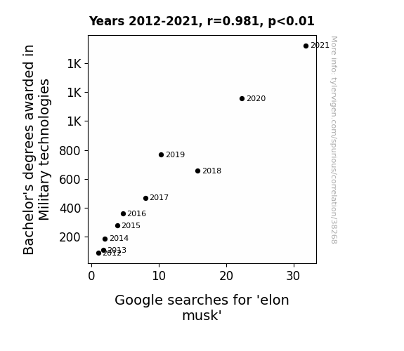 This means 96.2% of the change in the one variable (i.e., Google searches for 'elon musk') is predictable based on the change in the other (i.e., Bachelor's degrees awarded in Military technologies) over the 10 years from 2012 through 2021.