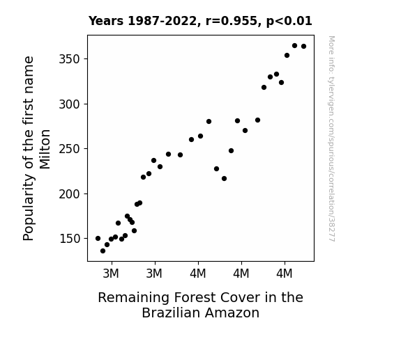 This means 91.3% of the change in the one variable (i.e., Remaining Forest Cover in the Brazilian Amazon) is predictable based on the change in the other (i.e., Popularity of the first name Milton) over the 36 years from 1987 through 2022.