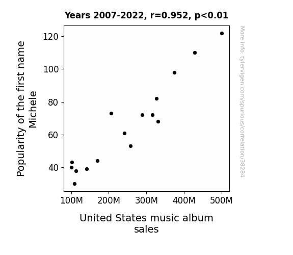This means 90.7% of the change in the one variable (i.e., United States music album sales) is predictable based on the change in the other (i.e., Popularity of the first name Michele) over the 16 years from 2007 through 2022.