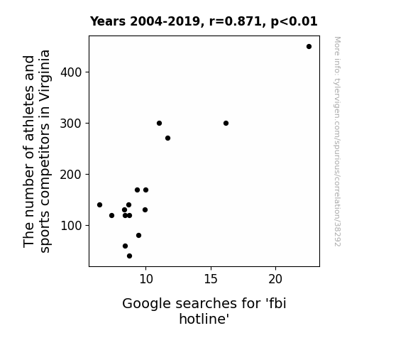 This means 75.8% of the change in the one variable (i.e., Google searches for 'fbi hotline') is predictable based on the change in the other (i.e., The number of athletes and sports competitors in Virginia) over the 16 years from 2004 through 2019.