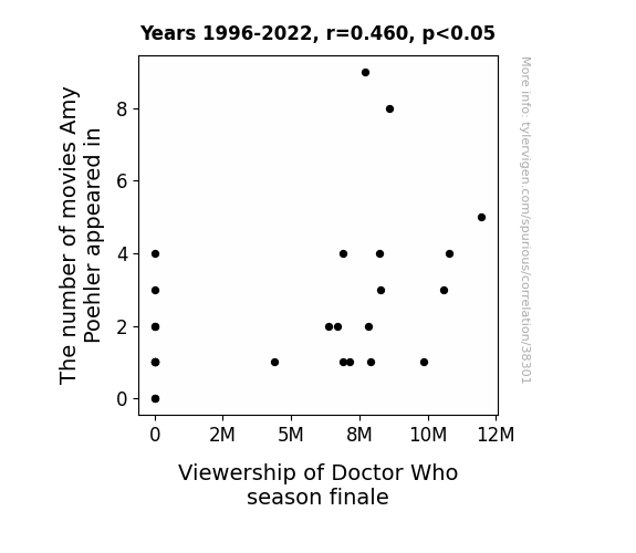 This means 21.1% of the change in the one variable (i.e., Viewership of Doctor Who season finale) is predictable based on the change in the other (i.e., The number of movies Amy Poehler appeared in) over the 27 years from 1996 through 2022.