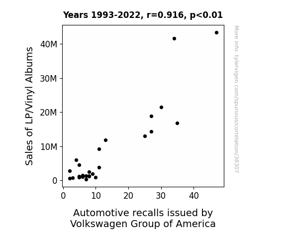 This means 83.8% of the change in the one variable (i.e., Automotive recalls issued by Volkswagen Group of America) is predictable based on the change in the other (i.e., Sales of LP/Vinyl Albums) over the 30 years from 1993 through 2022.